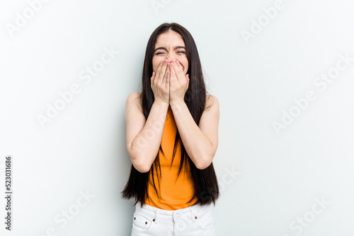 Young caucasian woman isolated on white background laughing about something, covering mouth with hands.