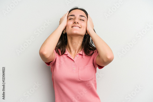 Young caucasian woman isolated on white background laughs joyfully keeping hands on head. Happiness concept.
