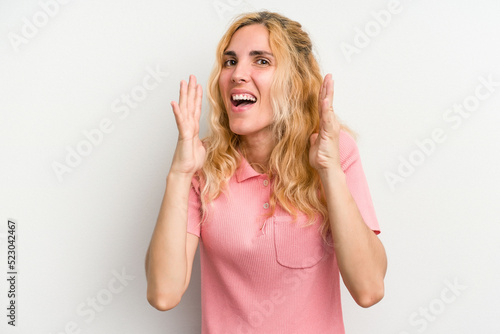 Young caucasian woman isolated on white background laughs out loudly keeping hand on chest.