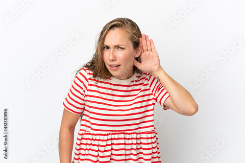 Young caucasian woman isolated on white background listening to something by putting hand on the ear