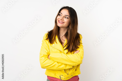 Young caucasian woman isolated on white background looking up while smiling