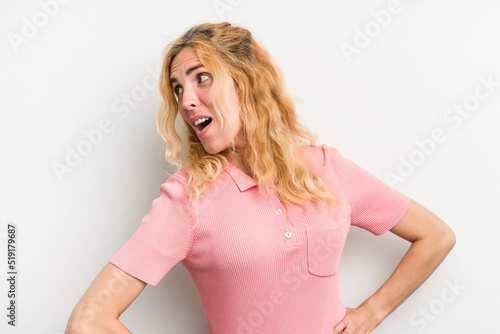 Young caucasian woman isolated on white background looks aside smiling, cheerful and pleasant.