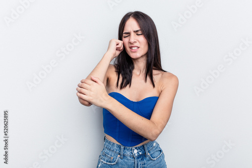 Young caucasian woman isolated on white background massaging elbow, suffering after a bad movement.