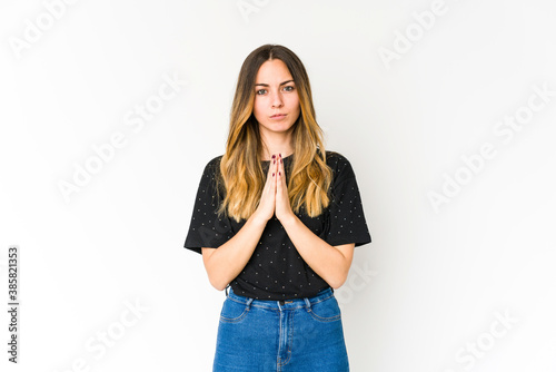 Young caucasian woman isolated on white background praying, showing devotion, religious person looking for divine inspiration.