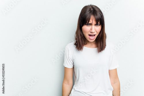 Young caucasian woman isolated on white background shouting very angry, rage concept, frustrated.