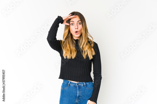 Young caucasian woman isolated on white background shouts loud, keeps eyes opened and hands tense.