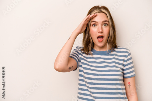 Young caucasian woman isolated on white background shouts loud, keeps eyes opened and hands tense.