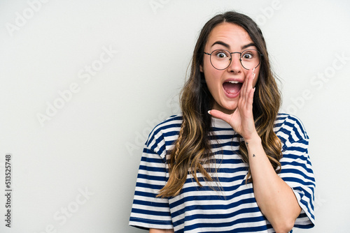 Young caucasian woman isolated on white background shouts loud, keeps eyes opened and hands tense.