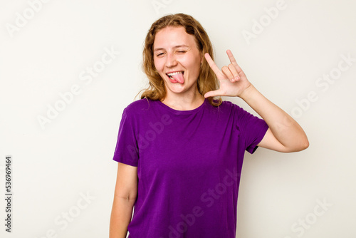 Young caucasian woman isolated on white background showing a horns gesture as a revolution concept.