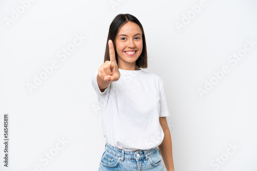 Young caucasian woman isolated on white background showing and lifting a finger
