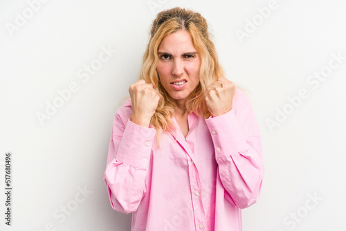 Young caucasian woman isolated on white background showing fist to camera, aggressive facial expression.