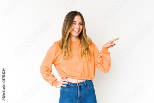 Young caucasian woman isolated on white background smiling cheerfully pointing with forefinger away.