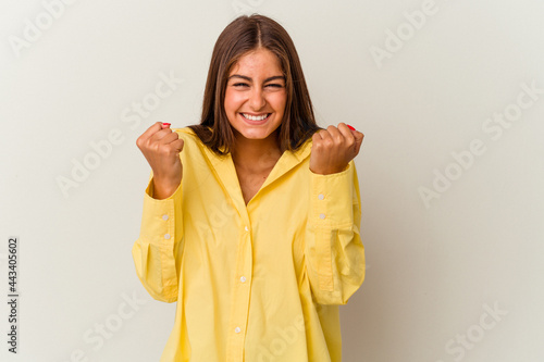 Young caucasian woman isolated on white background smiling happy and confident, touching chin with hand.