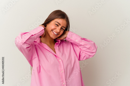 Young caucasian woman isolated on white background stretching arms, relaxed position.