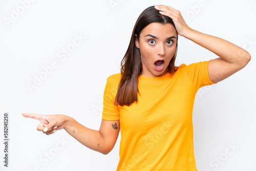 Young caucasian woman isolated on white background surprised and pointing finger to the side
