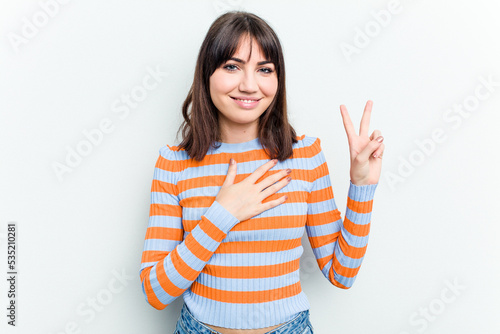 Young caucasian woman isolated on white background taking an oath, putting hand on chest.