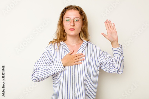 Young caucasian woman isolated on white background taking an oath, putting hand on chest.