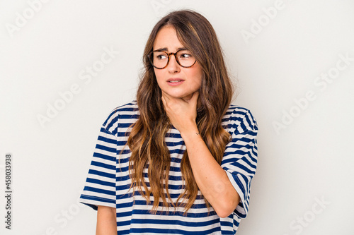 Young caucasian woman isolated on white background touching back of head, thinking and making a choice.