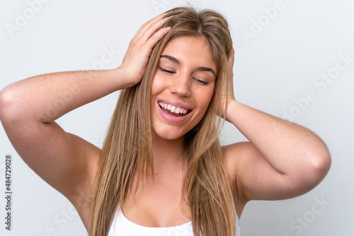 Young caucasian woman isolated on white background touching her hair. Close up portrait