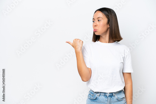 Young caucasian woman isolated on white background unhappy and pointing to the side