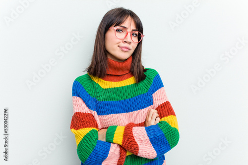 Young caucasian woman isolated on white background unhappy looking in camera with sarcastic expression.