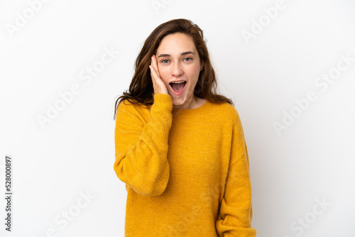 Young caucasian woman isolated on white background with surprise and shocked facial expression