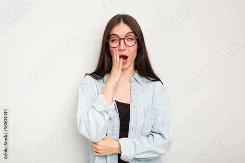 Young caucasian woman isolated on white background yawning showing a tired gesture covering mouth with hand.