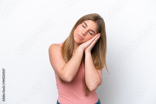 Young caucasian woman isolated on white bakcground making sleep gesture in dorable expression