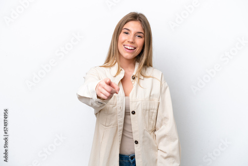 Young caucasian woman isolated on white bakcground surprised and pointing front