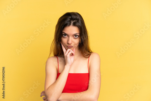 Young caucasian woman isolated on yellow background and thinking
