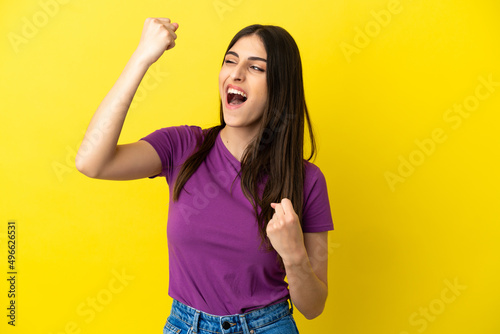 Young caucasian woman isolated on yellow background celebrating a victory