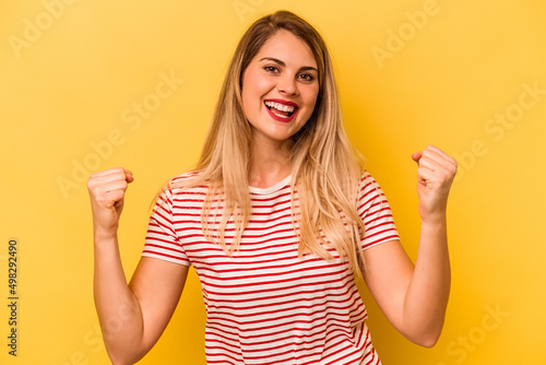 Young caucasian woman isolated on yellow background cheering carefree and excited. Victory concept.