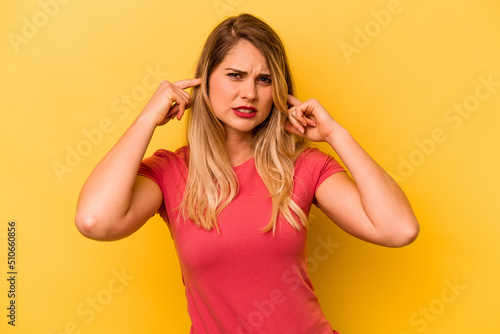 Young caucasian woman isolated on yellow background covering ears with fingers, stressed and desperate by a loudly ambient.