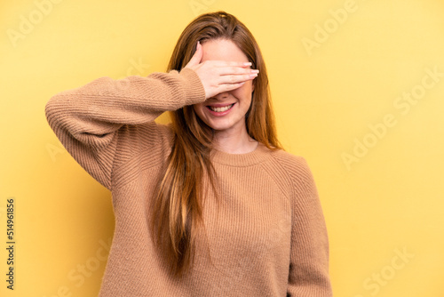Young caucasian woman isolated on yellow background covers eyes with hands, smiles broadly waiting for a surprise.