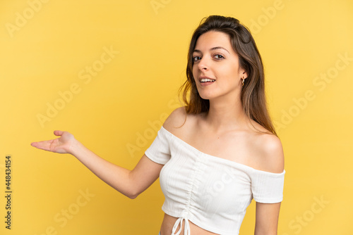 Young caucasian woman isolated on yellow background extending hands to the side for inviting to come
