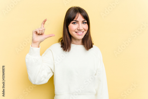 Young caucasian woman isolated on yellow background holding something little with forefingers, smiling and confident.