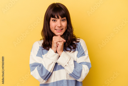 Young caucasian woman isolated on yellow background keeps hands under chin, is looking happily aside.