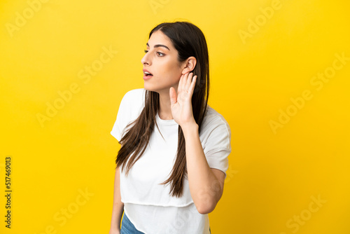 Young caucasian woman isolated on yellow background listening to something by putting hand on the ear