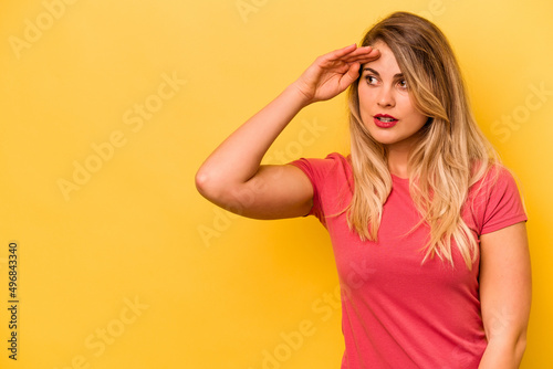 Young caucasian woman isolated on yellow background looking far away keeping hand on forehead.