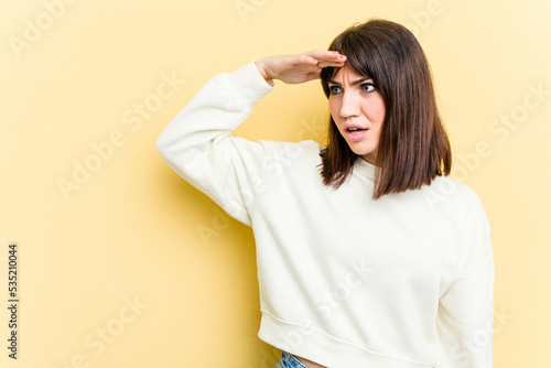Young caucasian woman isolated on yellow background looking far away keeping hand on forehead.