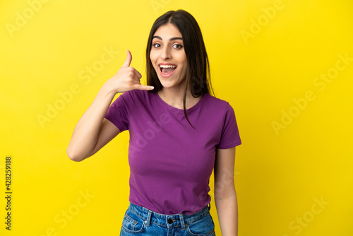 Young caucasian woman isolated on yellow background making phone gesture. Call me back sign