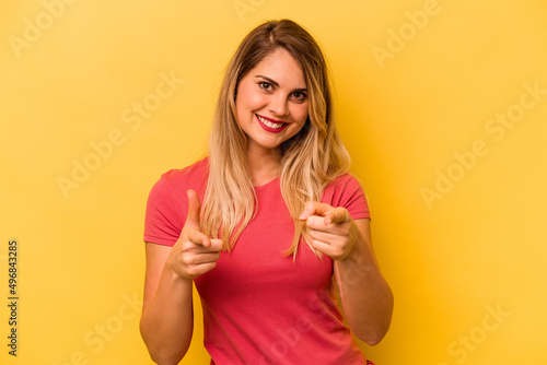 Young caucasian woman isolated on yellow background pointing to front with fingers.