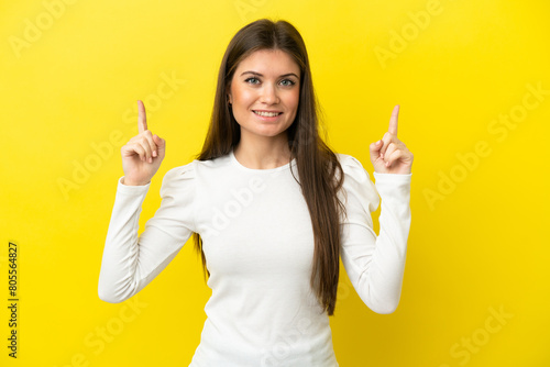 Young caucasian woman isolated on yellow background pointing up a great idea