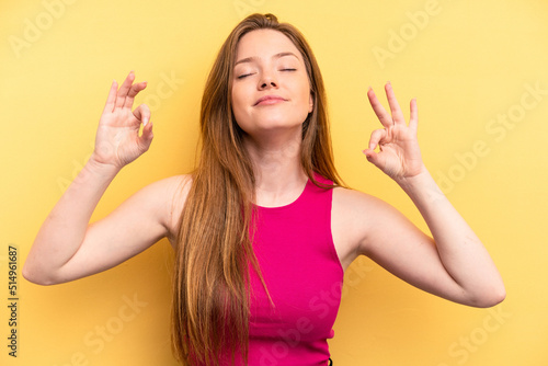 Young caucasian woman isolated on yellow background relaxes after hard working day, she is performing yoga.