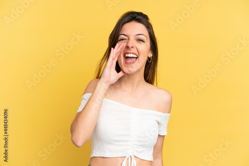 Young caucasian woman isolated on yellow background shouting with mouth wide open
