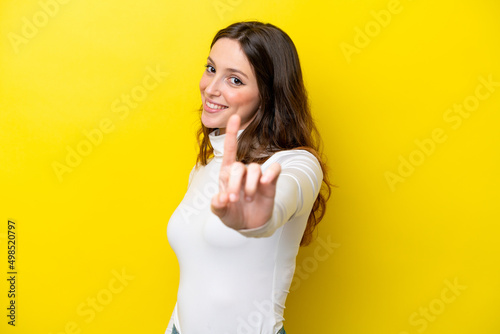 Young caucasian woman isolated on yellow background showing and lifting a finger