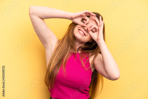 Young caucasian woman isolated on yellow background showing okay sign over eyes