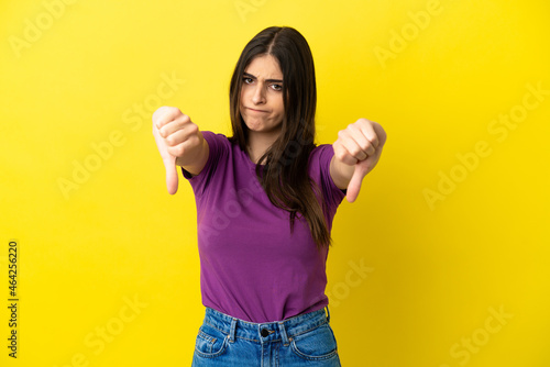 Young caucasian woman isolated on yellow background showing thumb down with two hands
