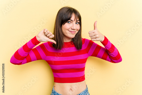Young caucasian woman isolated on yellow background showing thumbs up and thumbs down, difficult choose concept