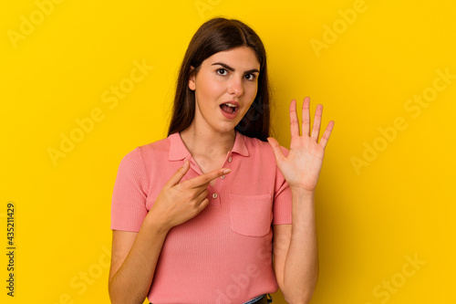 Young caucasian woman isolated on yellow background smiling cheerful showing number five with fingers.